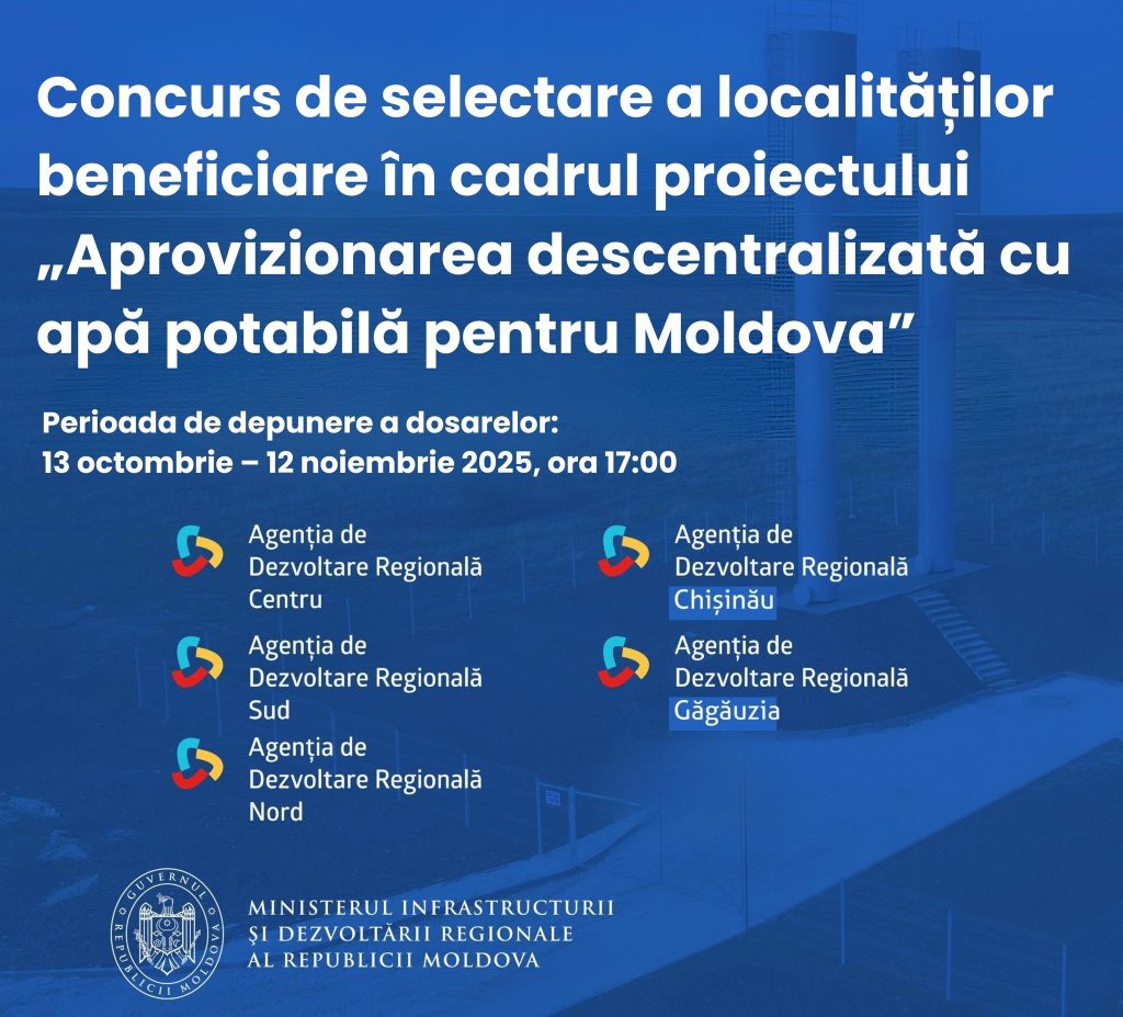 Ministerul Infrastructurii şi Dezvoltării Regionale informează că în conformitate cu prevederile Acordului de împrumut dintre Guvernul Republicii Moldova şi Guvernul Regatului Belgiei pentru realizarea proiectului „Aprovizionarea descentralizată cu apă potabilă pentru Moldova”, ratificat prin Legea nr. 234/2025, începând cu data de 13 octombrie 2025, se dă startul concursului de selectare a localităților beneficiare în cadrul proiectului „Aprovizionarea descentralizată cu apă potabilă pentru Moldova”.